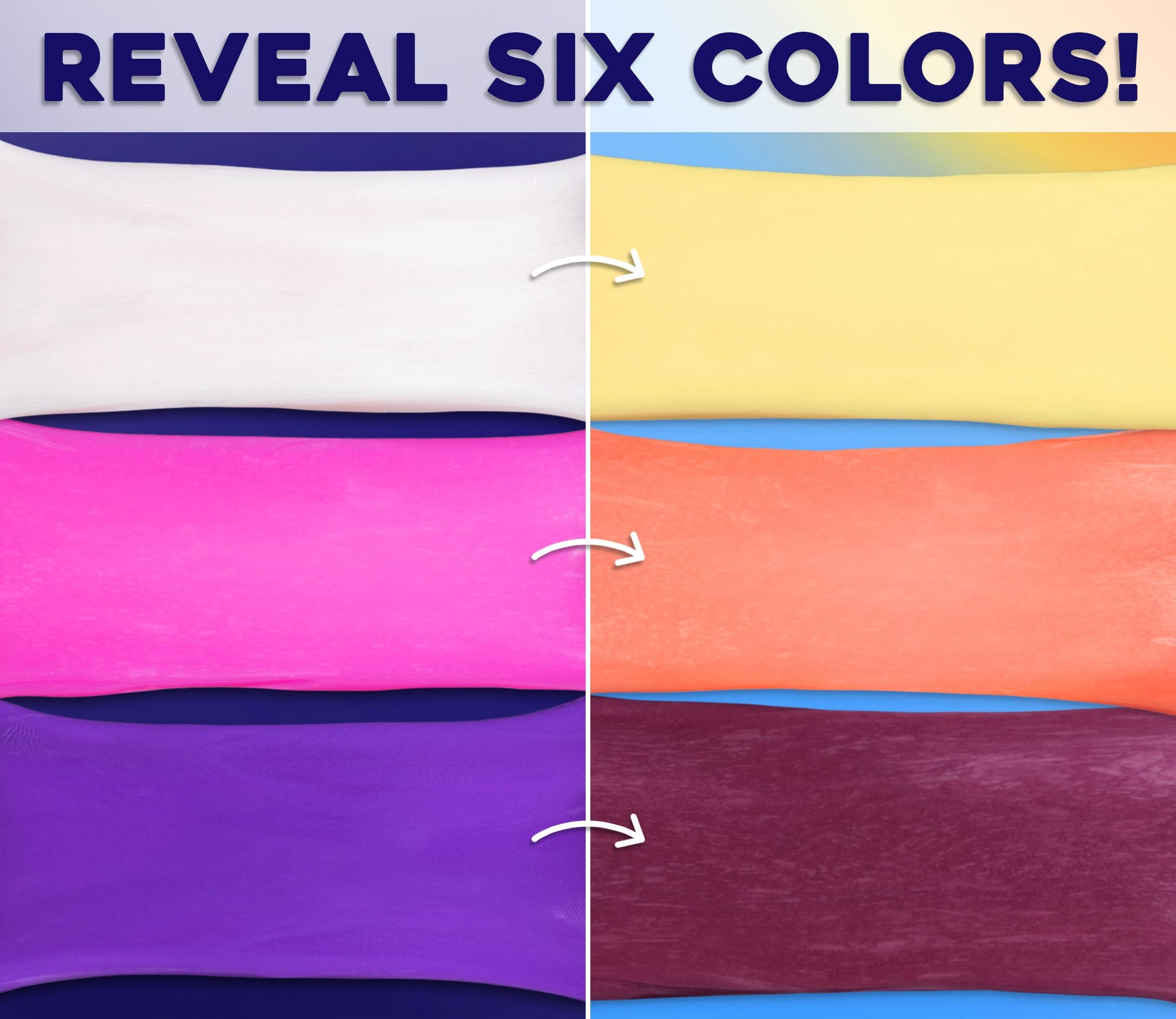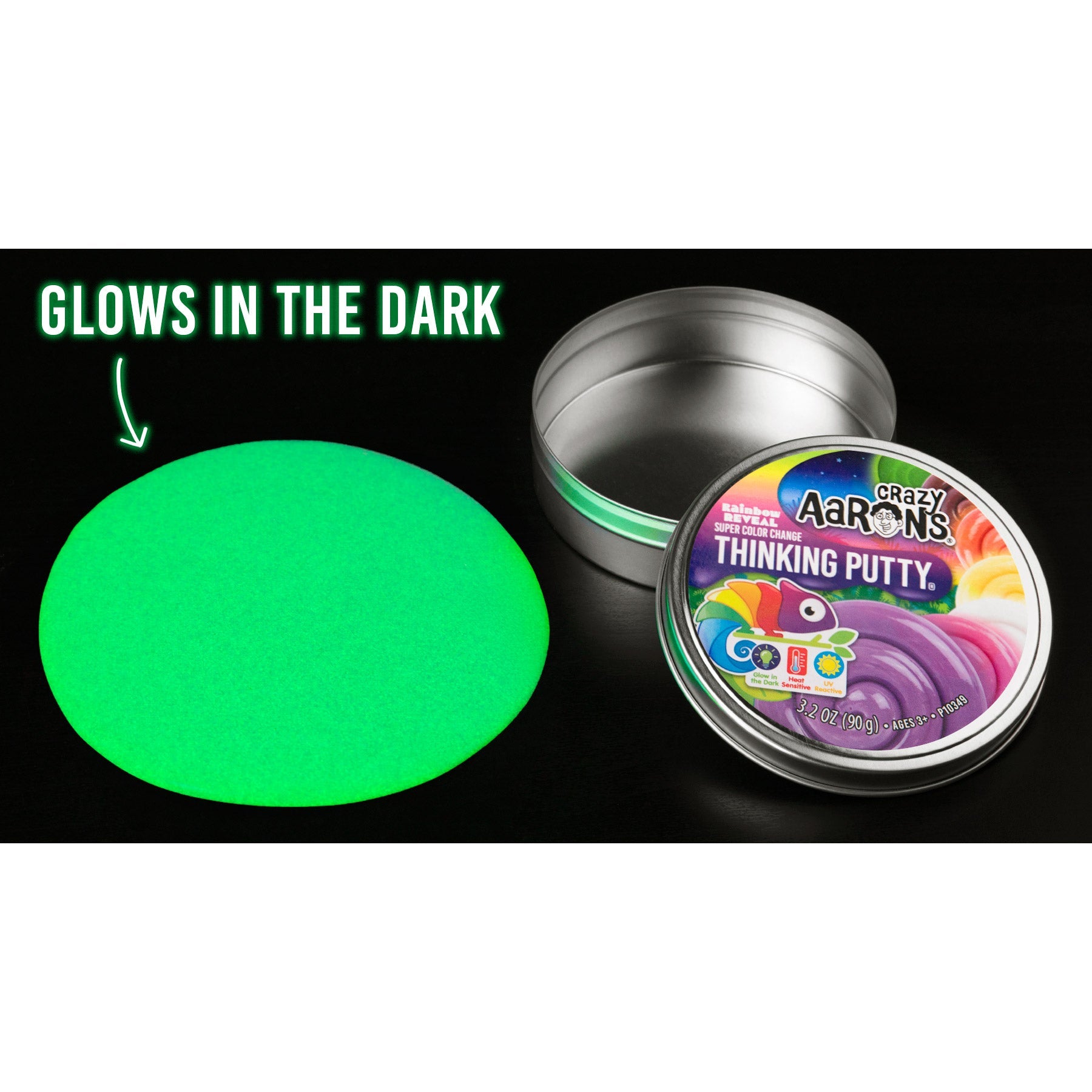 Uncover the mystery of Rainbow Reveal Thinking Putty! This special putty features three incredible color-shifting effects that reveal a rainbow of hues. Watch it transform before your eyes with the warmth of your hands and then morph again in the sunlight. But that’s not all- turn off the lights and see it glow with a radiant surprise. How many colors can you find?