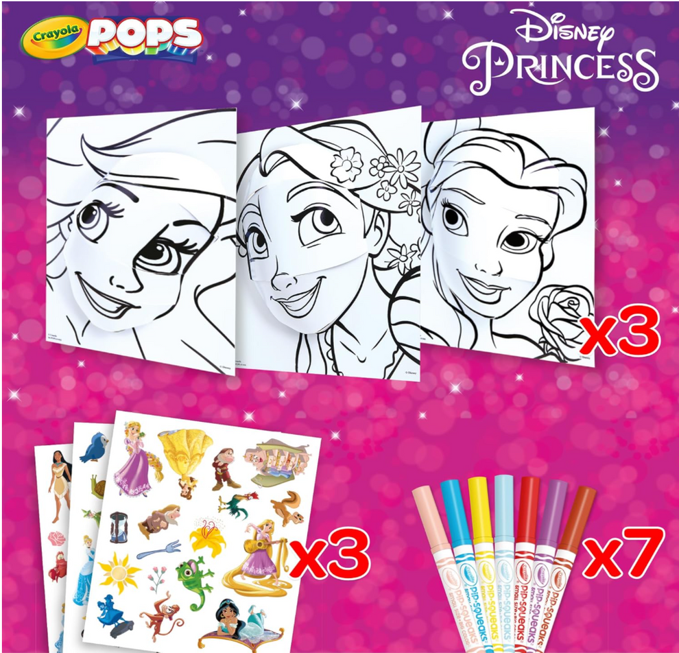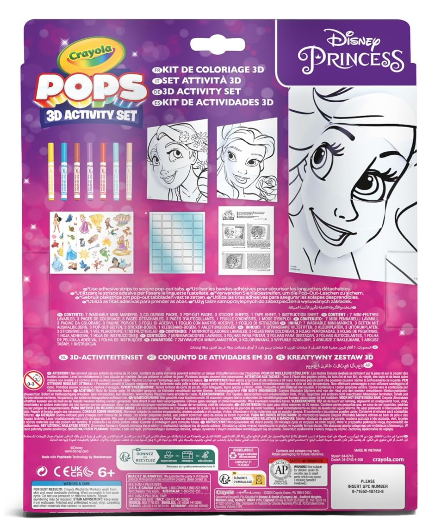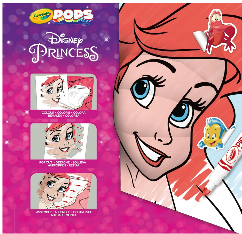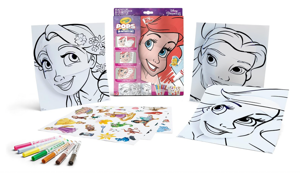 Bring your favourite Disney Princesses to life with Crayola POPS! Colour, build, and transform characters like Cinderella, Belle, and Ariel into stunning 3D creations. Simply use the included washable markers to colour the backgrounds and cards, pop out the pre-cut pieces, and assemble your 3D masterpieces. Add stickers for a magical finishing touch and proudly display your creations. This resealable set includes 3 background cards, 3 POP 3D cards, 7 washable markers, 3 sticker sheets, and adhesive tape—perfect for Disney Princess fans and creative kids
