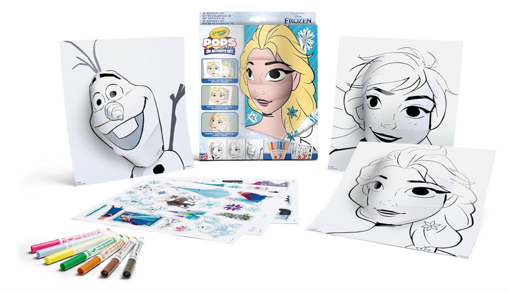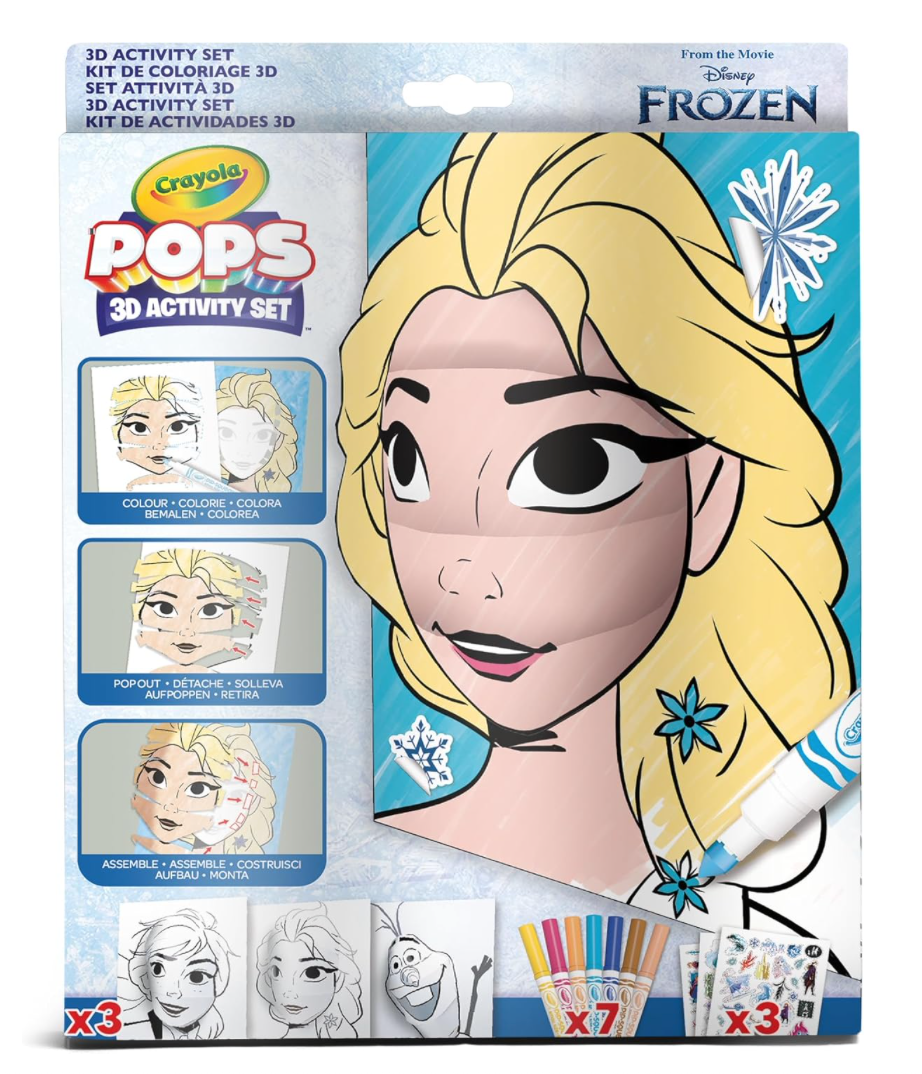 Bring the magic of Disney Frozen to life with Crayola POPS! Colour, build, and transform your favourite characters—Elsa, Anna, and Olaf—into stunning 3D creations. Simply colour the background and cards with the included washable markers, pop out the pre-cut pieces, and watch as your characters come to life! Add stickers for a unique touch and display your 3D masterpieces in your room. This portable, resealable set includes 3 background cards, 3 POP 3D cards, 7 washable markers, 3 sticker sheets, and adhesive tape. Perfect for Frozen fans and budding artists!