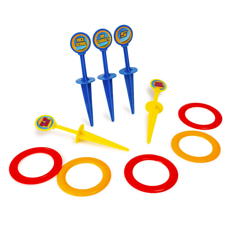 Simply place the pegs into any soft ground, aim at the pegs and throw your hoop, whoever gets the highest score or loops the pegs in number order first is the winner!