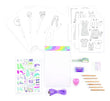 Includes a tracing tablet, micro-USB/5V charging cord, five pencil crayons, graphite pencil, sticker sheet, gem sticker sheet, 20 model pages, four tracing pages, roll of washi tape (5m), pencil sharpener, eraser and instruction sheet