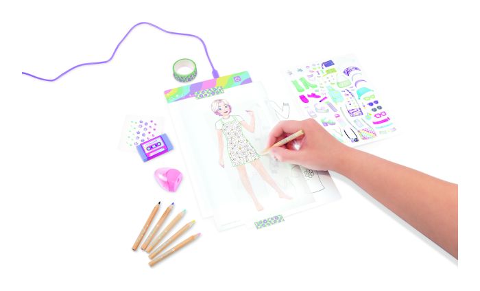 This lightweight, portable, light-up drawing pad makes learning drawing skills, blending colours, matching patterns, and creating looks simpler than ever. The set also includes a micro-USB/5V charging cord, an instruction booklet and design accessories.