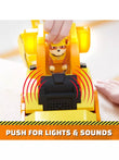 When it's time for action, clip Rubble onto the driver's seat and push him down to activate exciting lights and sound effects that you know from the show. Use the articulated excavator toy to start digging, then move your dirt out of the way using the moveable bulldozer scoop, just like Rubble does.