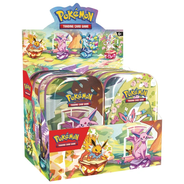 Every uniquely collectible Pokémon TCG Scarlet and Violet Prismatic Evolutions Mini Tin contains 2 booster packs, each with 10 cards and 1 basic energy, an art card, and an Eevee coin in 1 of 8 colours!