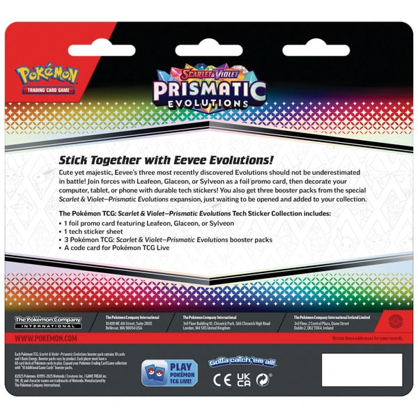 Join forces with Eevees Sylveon evolution in this Prismatic Evolutions Tech Sticker Collection, with a foil promo card, a tech sticker sheet to decorate your electronics, and three booster packs from the Pokémon Trading Card Scarlet and Violet Prismatic Evolutions expansion!